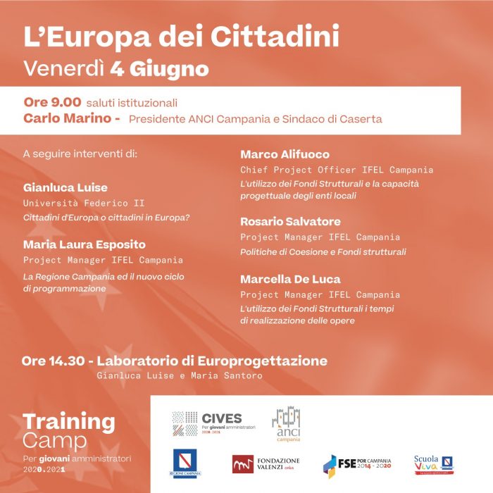 Venerdì 4 e sabato 5 giugno tornano a Sant’Anna dei Lombardi a Napoli i Training Camp per amministratori under 35 della Campania. «Cives», la scuola di formazione di ANCI Campania ospita sindaci, vicesindaci, assessori, consiglieri comunali, municipali e dei Forum dei Giovani under 35.