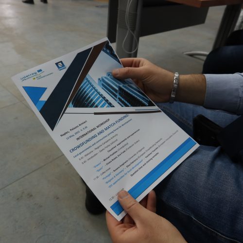 Di qui, diversi interventi che, nel corso del workshop, hanno descritto le loro esperienze/best-practice rappresentando lo stato dell’arte dei diversi paesi aderenti al Progetto. Per la Grecia, è intervenuto il Dott. Michael Psallidas di Crowdpolicy, per la Spagna, la Dott.ssa Chiara Rutolo della Fundación Goteo, per il Portogallo, la Prof.ssa Susana Imaginario dell’Università dell’Algarve mentre per le esperienze del Centro e del Nord Europa, la Dott.ssa Elisa Patriarca dello European Crowdfunding Network.