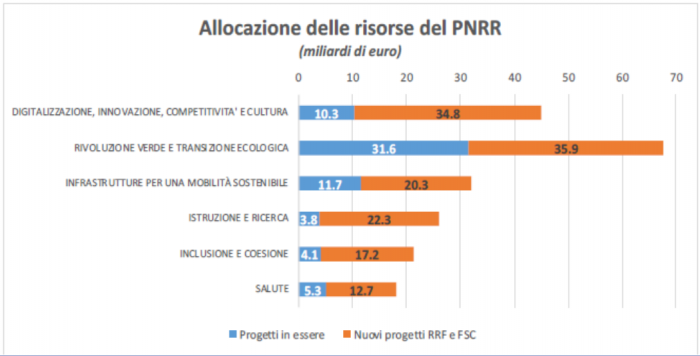Le risorse complessivamente allocate nelle sei missioni del PNRR sono pari a circa 210 miliardi di euro. Di questi, 144,2 miliardi finanziano “nuovi progetti” mentre i restanti 65,7 miliardi sono destinati a “progetti in essere” che riceveranno, grazie alla loro collocazione all’interno del PNRR, una significativa accelerazione dei profili temporali di realizzazione e quindi di spesa. Con il Piano, il Governo intende massimizzare le risorse destinate agli investimenti pubblici, la cui quota supera il 70%. Gli incentivi a investimenti privati sono pari a circa il 21%. Impiegando le risorse nazionali del Fondo di sviluppo e coesione 2021-2027 non ancora programmate, è stato possibile incrementare gli investimenti di circa 20 miliardi per nuovi progetti in settori importanti, che comprendono la rete ferroviaria veloce, la portualità integrata, il trasporto locale sostenibile, la banda larga e il 5G, il ciclo integrale dei rifiuti, l’infrastrutturazione sociale e sanitaria del Mezzogiorno.