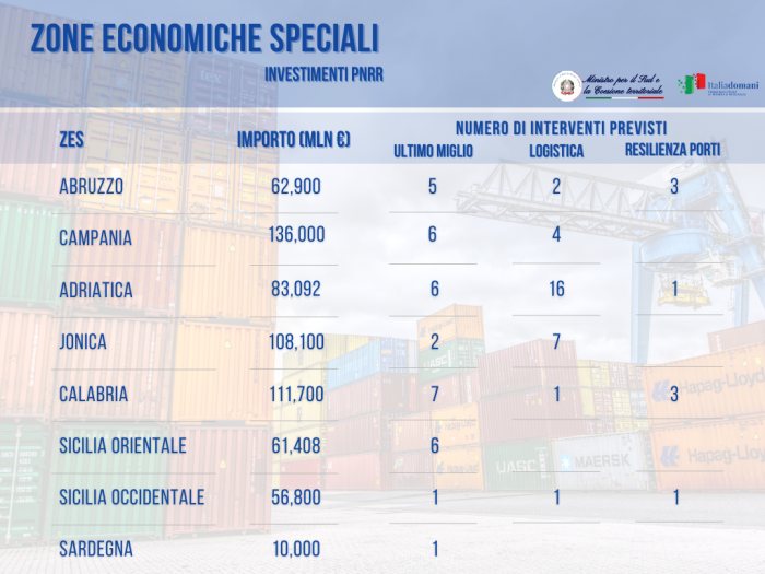 - digitalizzazione e potenziamento della logistica, urbanizzazioni green e lavori di efficientamento energetico e ambientale nelle aree retroportuali e nelle aree industriali appartenenti alle ZES;