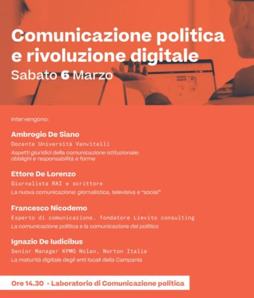 Per il secondo appuntamento sono previste le relazioni di Ambrogio De Siano, docente di Tecniche della redazione degli atti amministrativi all’Università «Vanvitelli», Ettore De Lorenzo, Giornalista Rai e scrittore, Francesco Nicodemo, esperto di comunicazione, fondatore di Lievito Consulting e Ignazio De Iudicibus, senior manager di KPMG Nolan, Norton Italia.